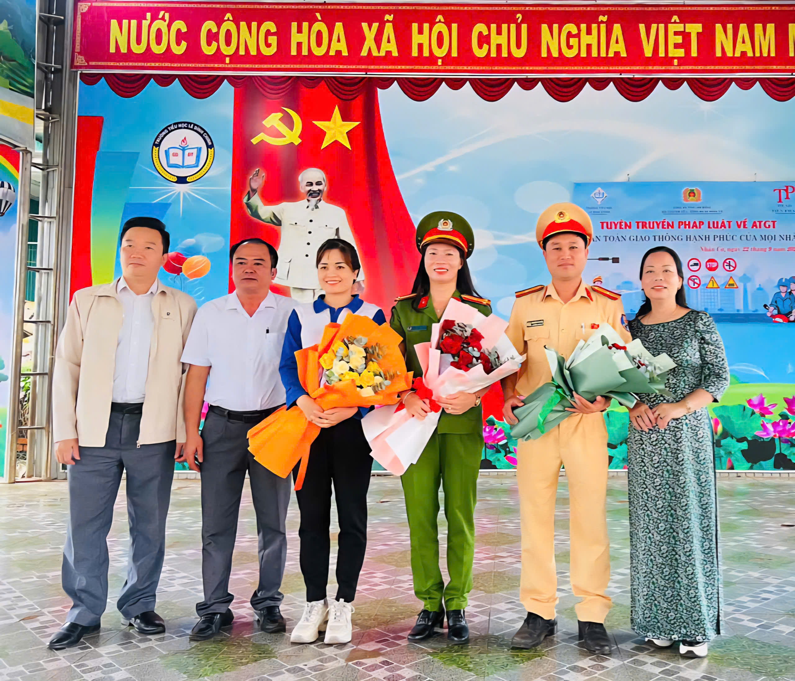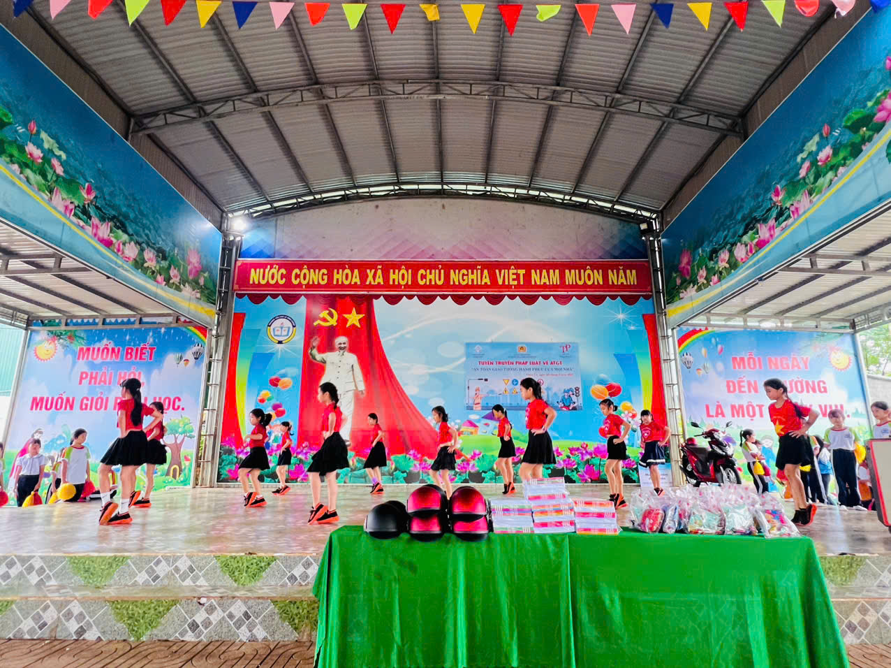 Sáng ngày 22 tháng 9 năm 2025, trường Tiểu học Lê Đình Chinh xã Nhân Cơ rất vinh dự được Đội Cảnh sát giao thông số 5 Phường Nam Gia Nghĩa, Công an xã Nhân Cơ cùng Công ty Honda Tiến Phát phối hợp tổ chức buổi tuyên truyền về an toàn giao thông cho các em học sinh. Đây là hoạt động có ý nghĩa thiết thực, góp phần nâng cao nhận thức, hình thành thói quen chấp hành luật giao thông, xây dựng văn hóa giao thông an toàn ngay từ lứa tuổi học sinh. Đặc biệt, Quý đơn vị Công an xã Nhân Cơ đã dành tặng 10 phần quà cho 10 em học sinh, đồng thời Công ty Honđa Tiến phát trao tặng mũ bảo hiểm cho 206 em học sinh lớp 1 trong toàn trường. Những phần quà ý nghĩa này không chỉ là sự động viên kịp thời mà còn là nguồn khích lệ to lớn, giúp các em nỗ lực hơn trong học tập và rèn luyện.