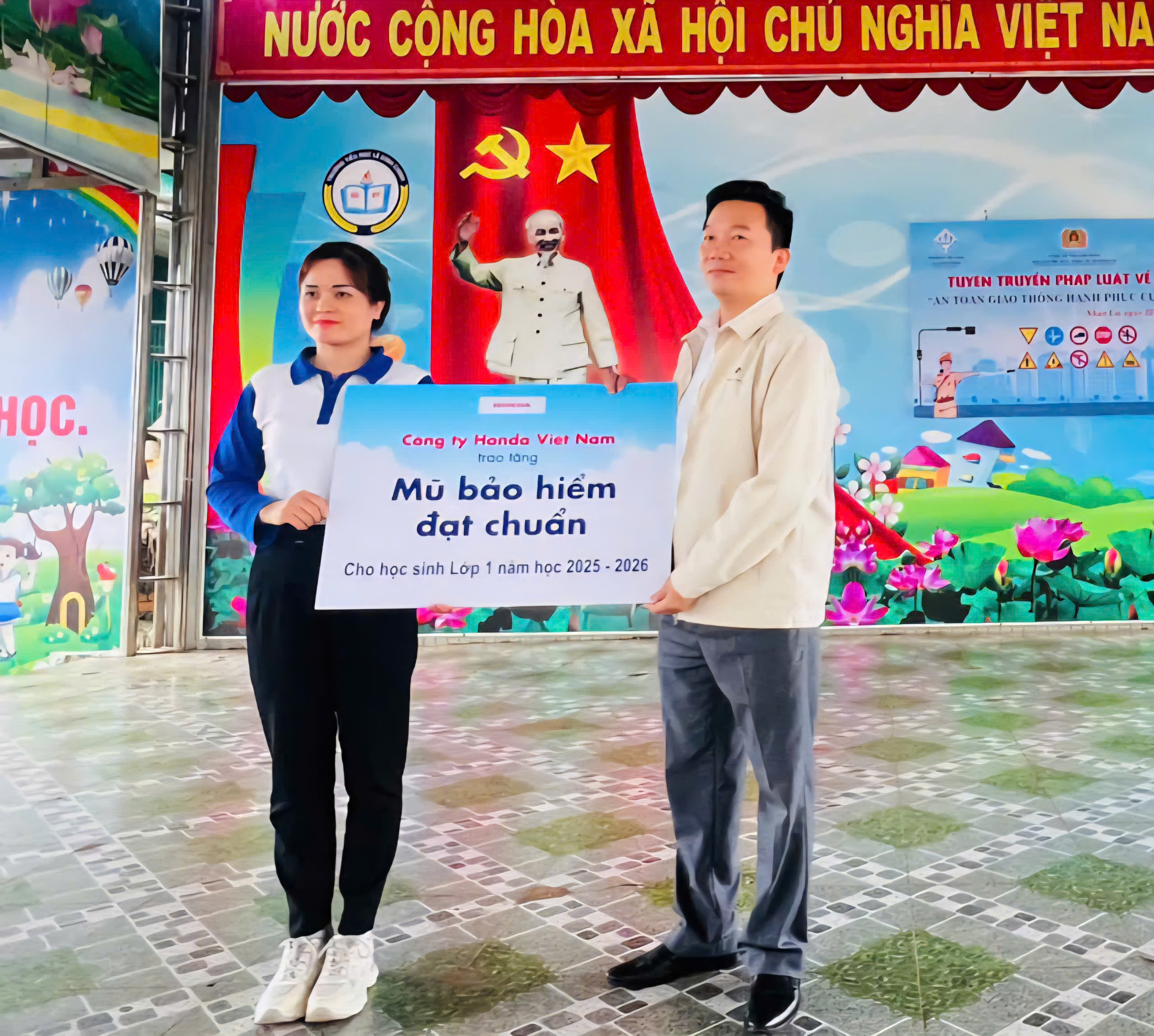 Đại diện “Honda Tiến Phát” trao tặng mũ bảo hiểm đạt chuẩn cho học sinh lớp 1